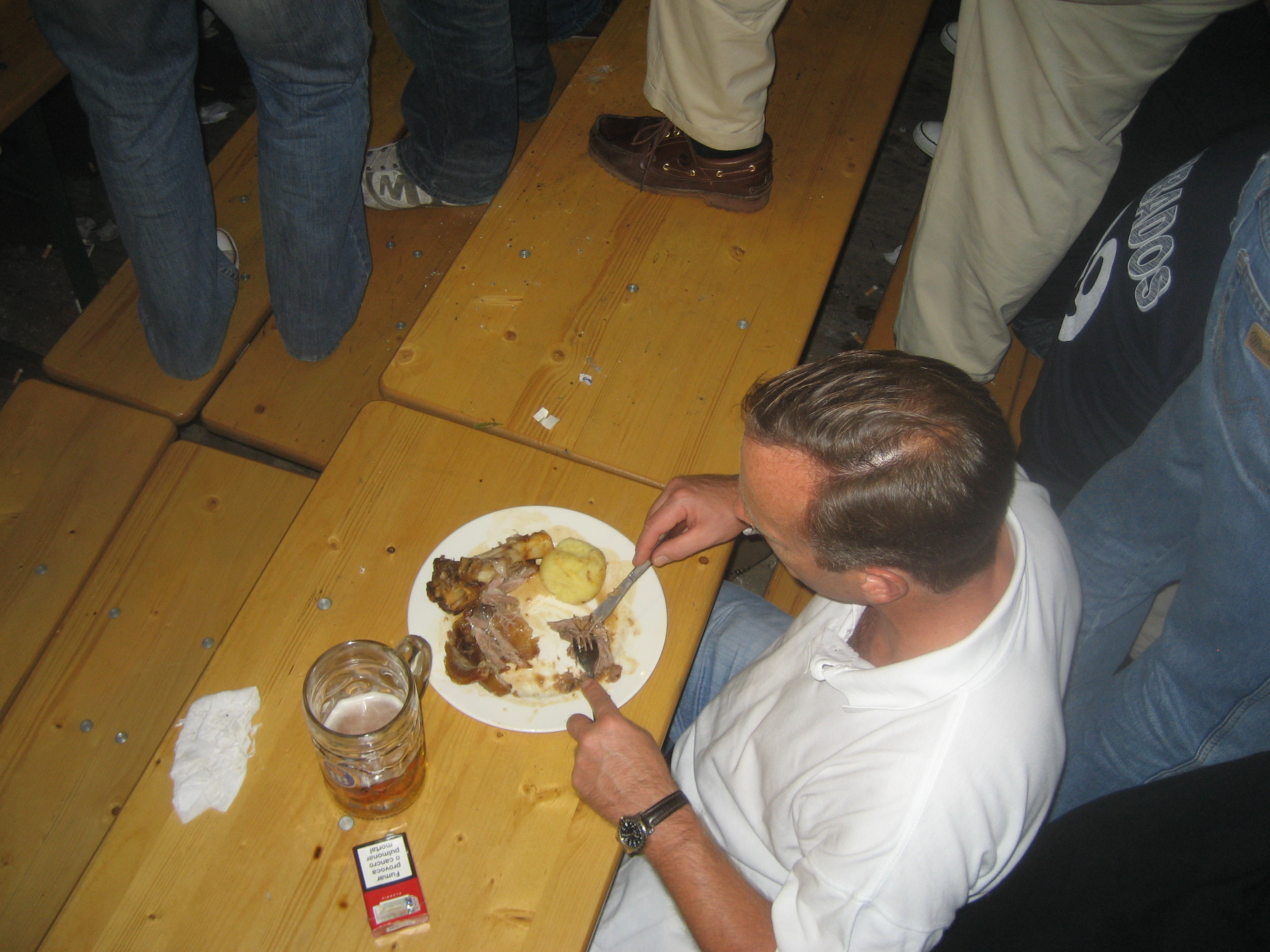 Nur einer hatte die Ruhe weg: Kai mampfte friedlich zwischen all diesen Beinen mit und ohne Wadlwärmern seine Schweinshaxn. Nach der dritten Maß und einem Weißbier-Absacker hatten wir alle unser Kampfgewicht in die nächste Gewichtsklasse angehoben.