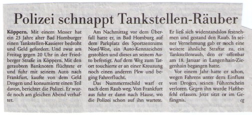 Was war passiert? Einem Ganoven hatte es gefallen, auf dem Parkplatz am Nord-West-Zentrum die Kennzeichen von Herrn v. Oppen zu entwenden, sie an sein Auto zu schrauben, um anschließend eine Tankstelle in Köppern zu überfallen. Wie dämlich man sich insgesamt bei so etwas anstellen kann, zeigt der nachfolgende Artikel aus der Taunuszeitung.