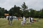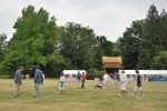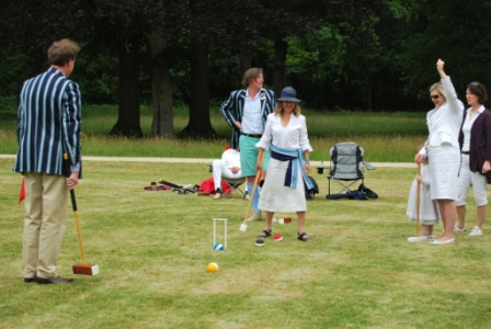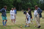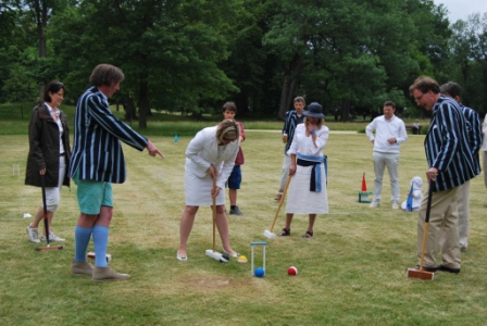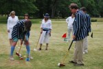 Gleichwohl wurden die bunten Kugeln mit viel Spaß und für uns ungewohnten Schlägern durch die Tore getrieben oder „krockiert“. In der ersten Runde spielten die beiden Matthias M. + v.T. versus Christian L. mit seiner Tochter, in der zweiten dann Christian H. und Nicolai gegen Katrin und Christine (7), deren Töchterlein zu den Klängen eines schottischen Dudelsacks tanzte. Hennes wollte sich vor der Olympiade in England seinen Schlag nicht verderben und blieb nur Zuschauer. Am Schluss gab es zwar keinen Sieger, aber viele Gewinner – auch in der Tombola.