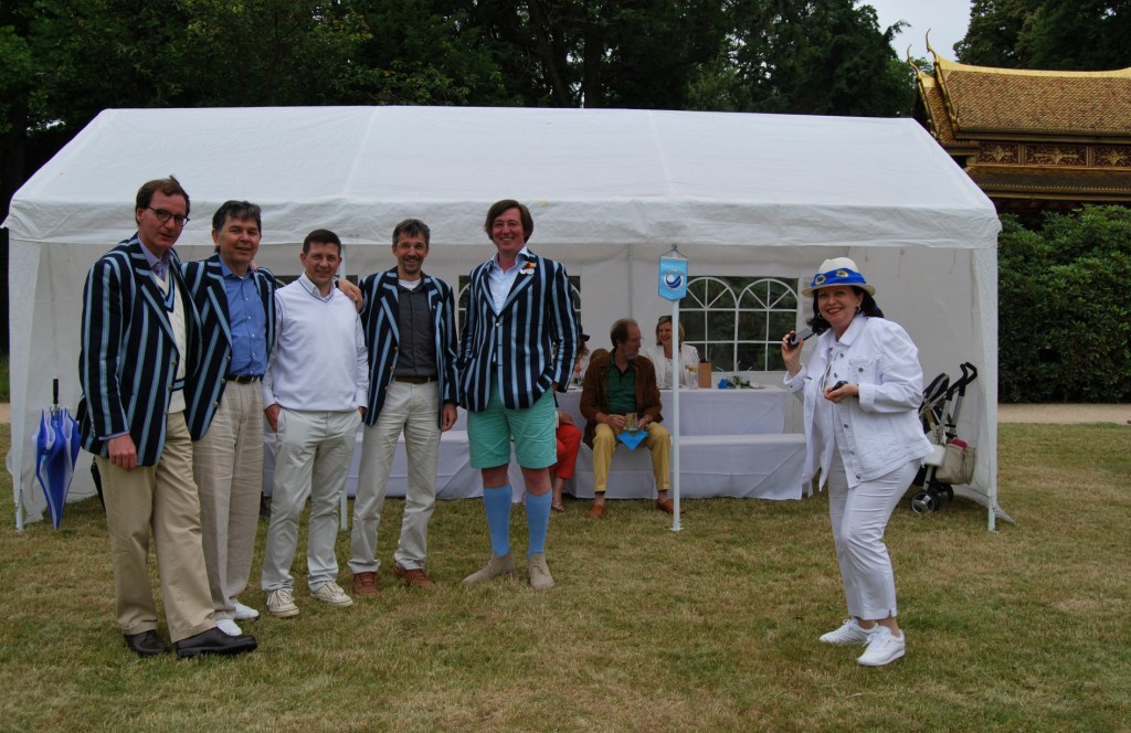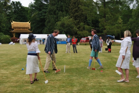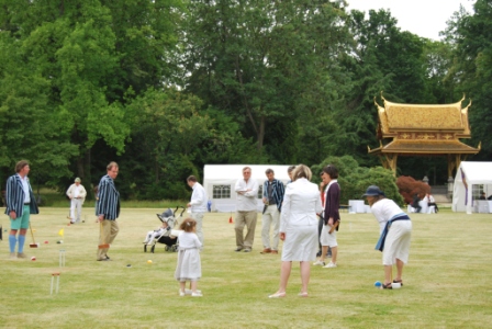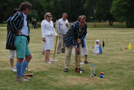 Da wir schon immer einmal im Kurpark auf traditionellem Hockey-Rasen (5) spielen wollten, es aber nie durften – der Kurdirektor hatte Angst um sein Grün und den goldenen Thai Sala (zu Kaisers Zeiten in Homburg Siam-Tempel genannt) –, wechselten wir die Sportart und meldeten uns zum Krocket-Turnier der Lions-Damen am 24. Juni 2012 an. Es wurde ein netter Nachmittag, obwohl das Wetter nicht so richtig mitspielte und einige der gemeldeten Mitspieler noch in Darmstadt beim „Heiner-Fest-Turnier“ im Endspiel (6) engagiert waren.