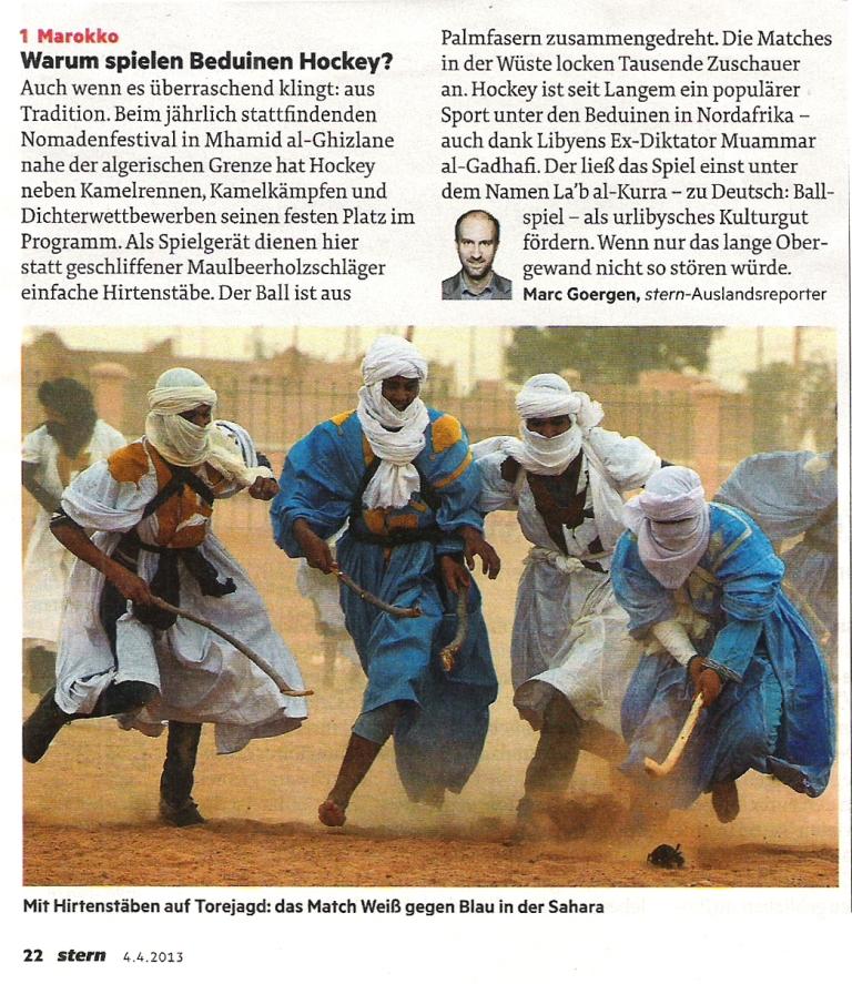 Schon mal etwas von Mhamid al-Ghizlane gehört? Nein? Dem können wir abhelfen. In diesem Ort in Marokko findet alljährlich ein Nomadenfestival statt, bei dem auch Hockey gespielt wird (oder das, was man dort dafür hält):