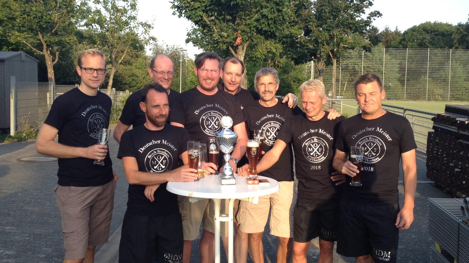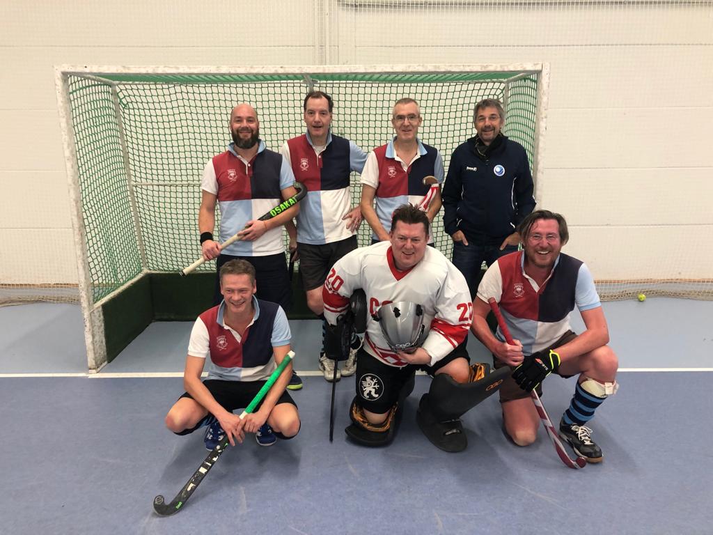 Beim Frühstück sahen (zum Glück alle) noch so aus wie sie waren, nämlich ziemlich mitgenommen von den Strapazen des ersten Tages und der Turnierfete. Aber hilft ja nix, also ausgecheckt und zurück in die Halle, zwei Spiele mussten wir ja noch „überleben“. Da uns Sven ganz früh schon verlassen hatte, um seinen Sohn als Betreuer auf den Hockeyplatz zu begleiten, hatten wir noch für das erste Spiel am Sonntag einen Ersatzkeeper aufzutreiben, was wir aber bereits auf der Feier eingetütet hatten. Natürlich stellt sich morgens dann immer noch die Frage, ob Gastspieler sich daran erinnert und auch tatsächlich aufschlägt, aber Balli vom späteren Turniersieger der Senioren (Concordia Tremoniensis) hielt Wort. Auch Seb (ebenfalls Concordia) – den Verfasser zu wirklich sehr später Stunde angesprochen hatte, ob er nicht noch aushelfen möchte – und Horst vom Gastgeber TSVL standen pünktlich auf dem Platz.