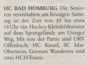 In nebelumwölkter, grauer Vorzeit, als Drachen noch die Erde bevölkerten und Burgfräulein raubten, um dann von edlen Rittern erschlagen zu werden, soll es in Homburg vor der Höhe noch Recken gegeben haben, die mit Hockeyschlägern auf heimatlichem Felde Turniere austrugen. So erzählen es wenigstens die Alten und holen aus ihren Schatullen die verstaubten Plaketten und Pokale, die sie errungen haben.