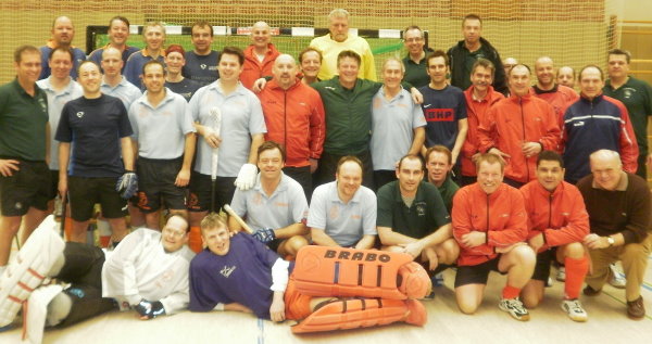 „Auf Initiative des Breitensportwartes des Hessischen Hockey-Verbandes, Hans-Günther Weber, fand Anfang Januar in der Güntherteichhalle in Hanau ein Ü40-Turnier statt. Und zwar an einem Freitagabend. Damit war gewährleistet, dass es neben dem Sport auch noch Zeit für Gespräche gab. Neben dem Gastgeber 1. Hanauer THC nahmen noch der Rüsselsheimer RK, der Wiesbadener THC und „Frankfurt-West“, eine Spielgemeinschaft aus Vorwärts und Höchst, teil. Es gab spannende und mit Einsatz geführte Spiele, die aber immer freundschaftlich verliefen und allen Beteiligten im Alter von 40 bis 60 Jahren und darüber viel Spaß machten. Ehemalige Bundesligaspieler maßen sich mit Mandatsträgern des HHV, ein Ex-Bundesligatrainer des THC traf auf seine ehemaligen Schützlinge.